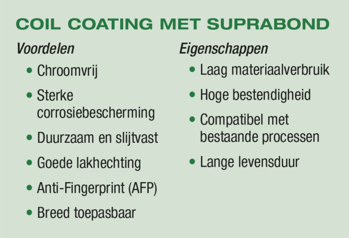Suprabond biedt maatwerk voor elk coil coating-proces en is geschikt voor vrijwel alle lak- en verfsystemen. De AFP-versie voorkomt bovendien zichtbare vingerafdrukken, waardoor oppervlakken er langer schoon en netjes uitzien. Suprabond is volledig chroomvrij en droogt vlekvrij op bij lage temperaturen vanaf 35°C. Dat biedt dus mogelijkheden voor serieuze energiebesparing.
